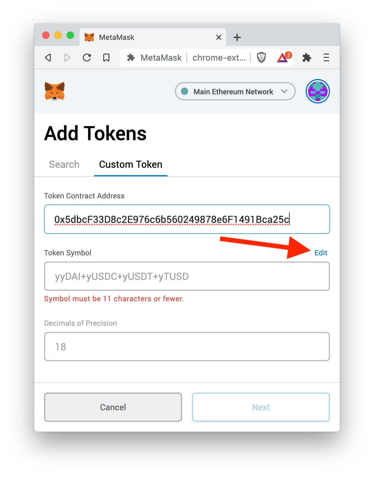 4) Paste the contract address for yUSD 0x5dbcF33D8c2E976c6b560249878e6F1491Bca25c into the Token Contract Address