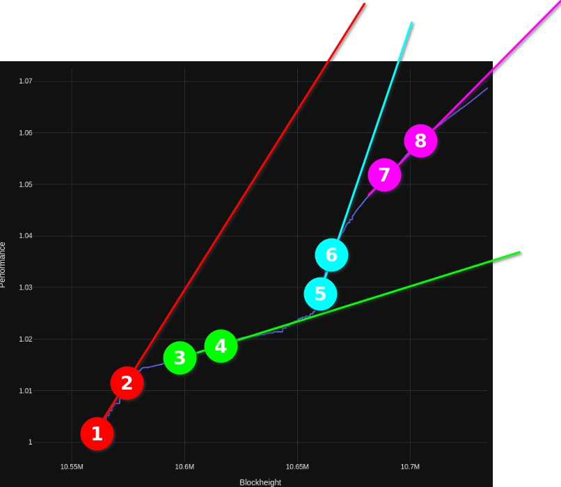 Here we take two points of the performance chart for the yUSD vault (numbered colored points) and apply the above. Notice that the different lines are relatively good indications for the short term, but when we try to use them to predict long term they're totally inaccurate!