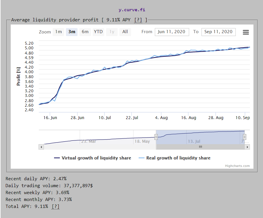 As of September 2020, the YTD annualized return for yPool liquidity providers is estimated to be 9.11%. Since yDAI+yUSD+yUSDT+yTUSD is a continuously accruing interest-bearing token, its price is above $1 and is constantly increasing.
